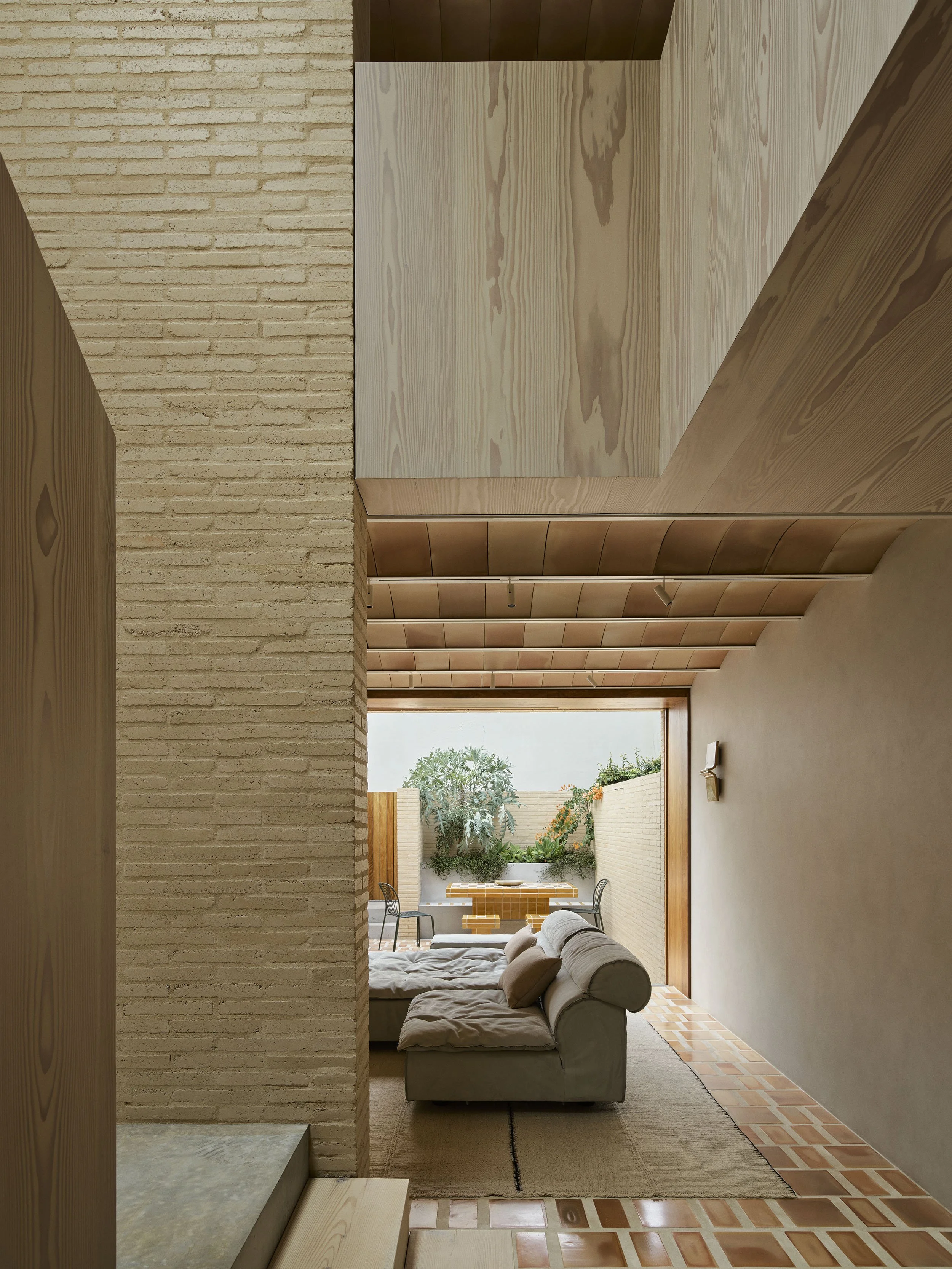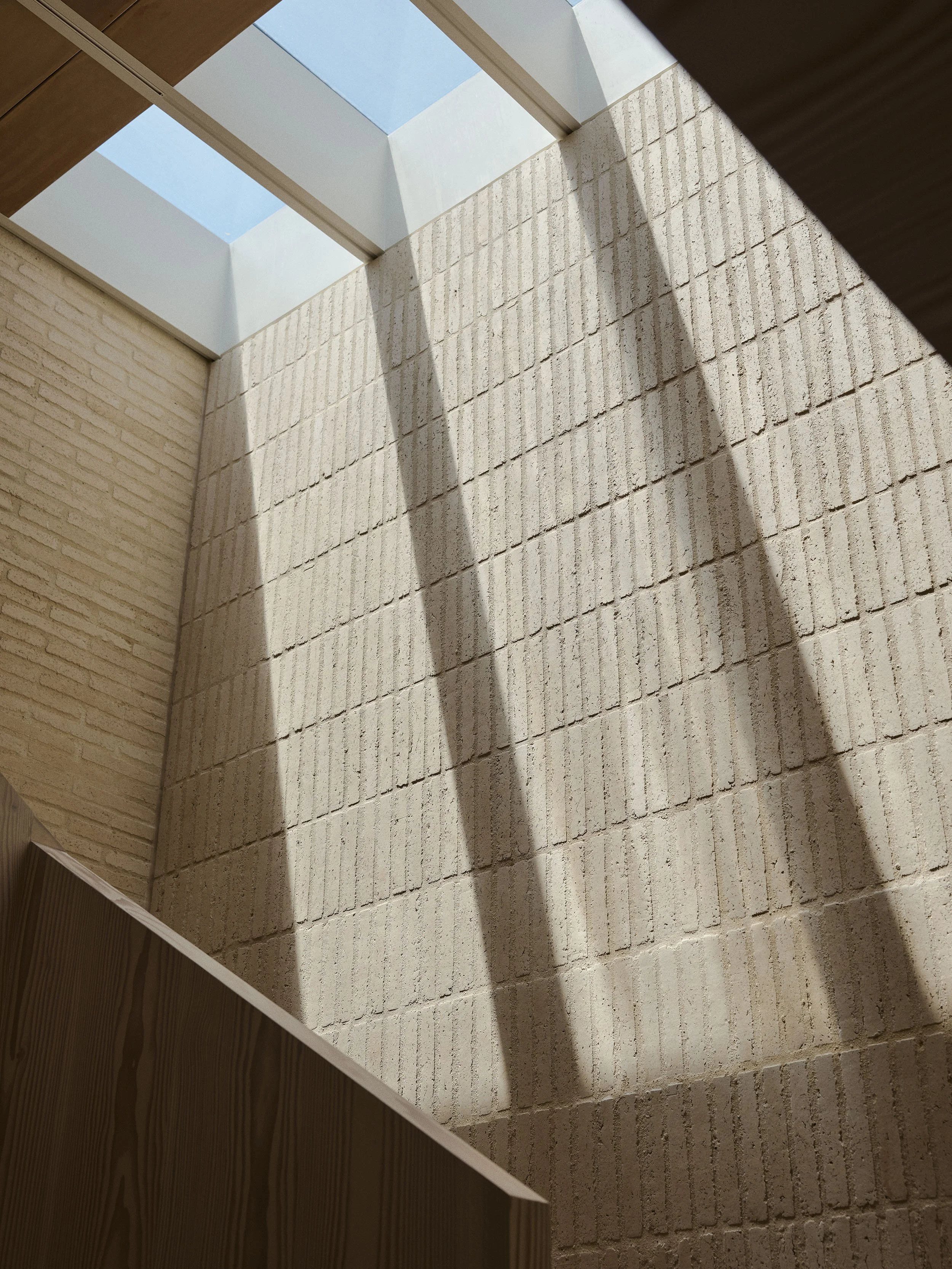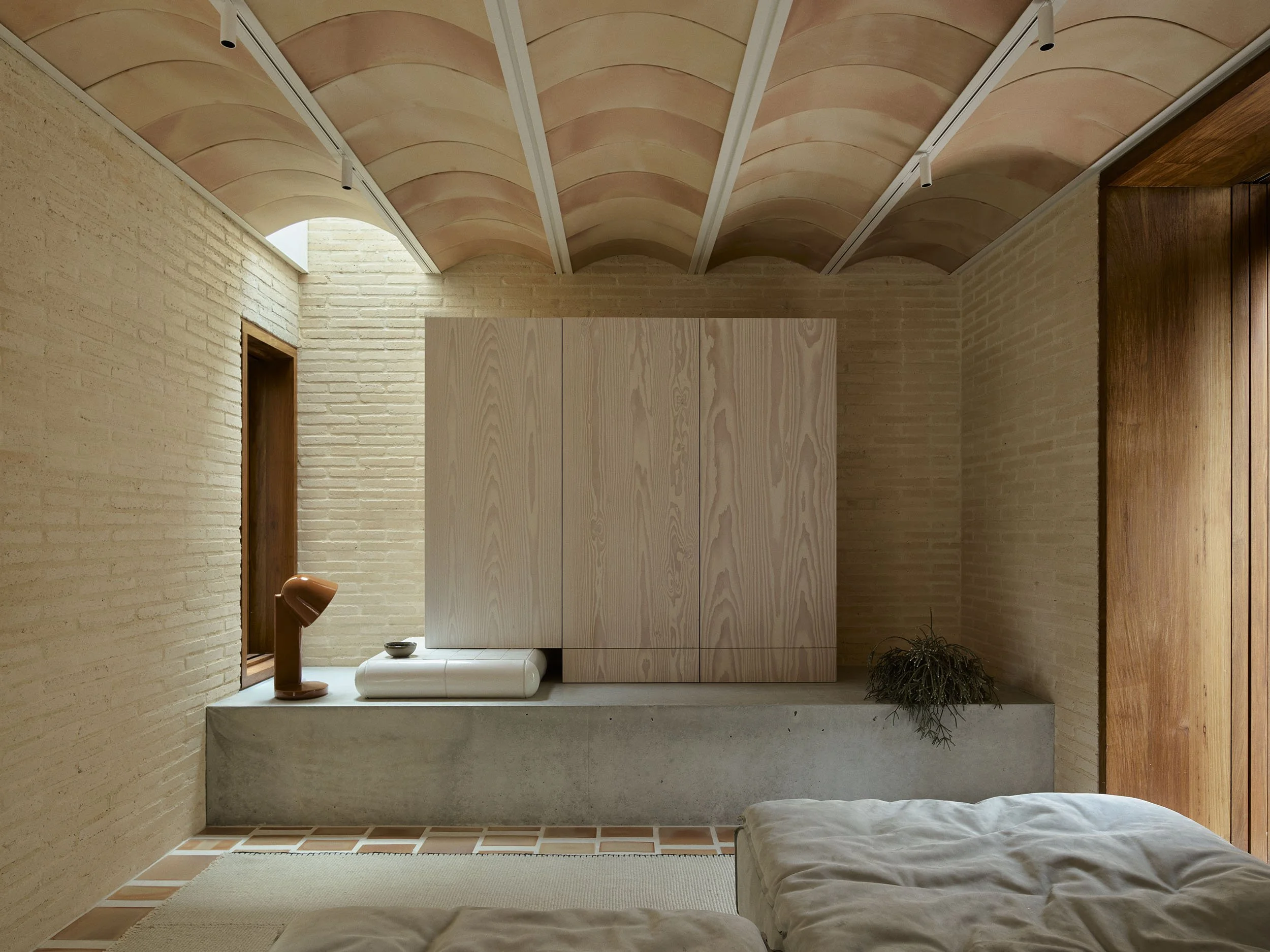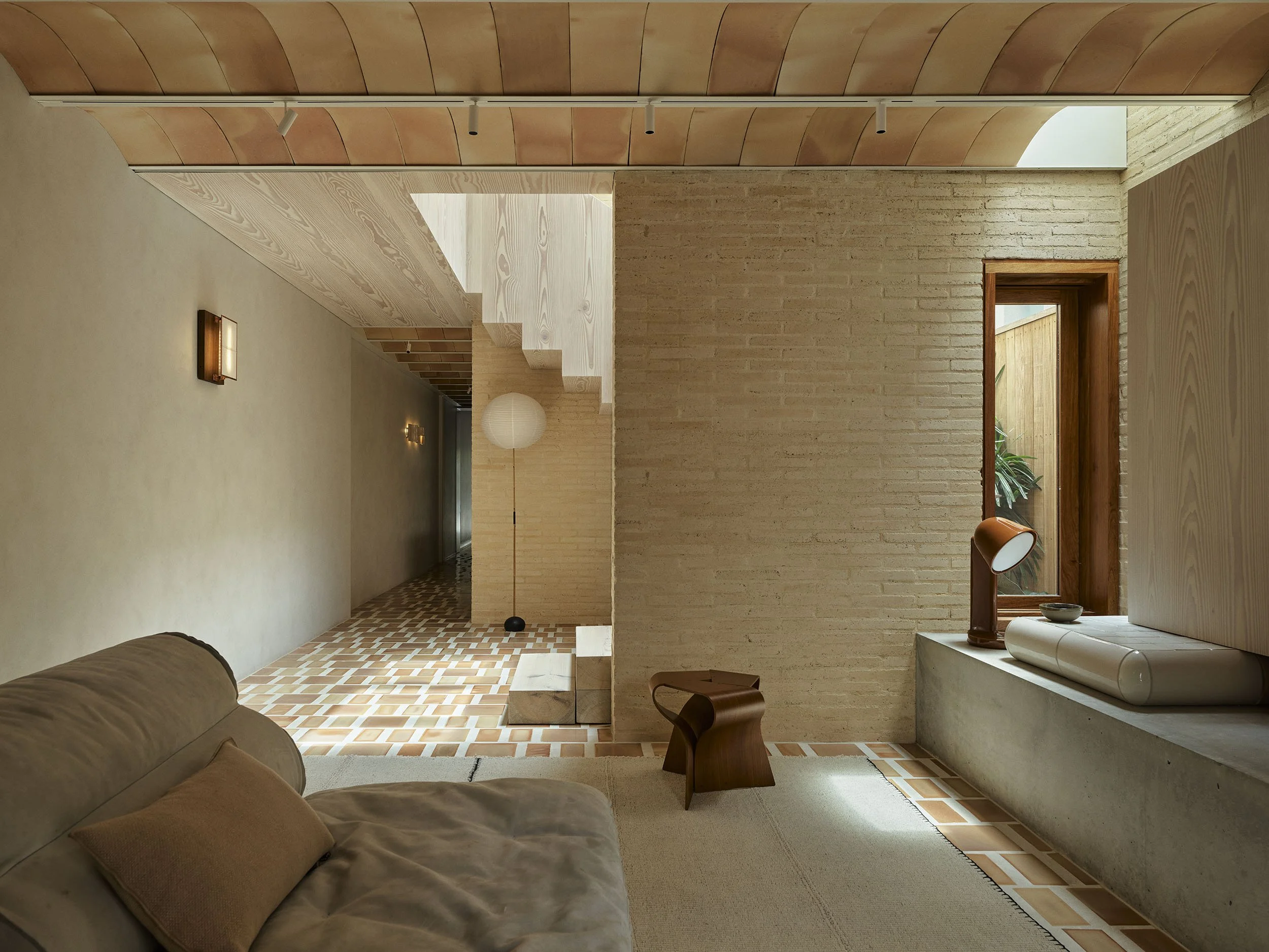 The ceiling system is one of the project’s clearest specification moves. A traditional Spanish construction method, bovedilla, was used to create little vaults across the ceiling. Steel beams span the width of the house, with tiles set between them to establish rhythm and texture. The beams were detailed to house the light fittings, avoiding the need to install fixtures directly onto the tiles themselves. The tiles were sourced from a small manufacturer in Majorca, who also produced the complementary floor tiles.