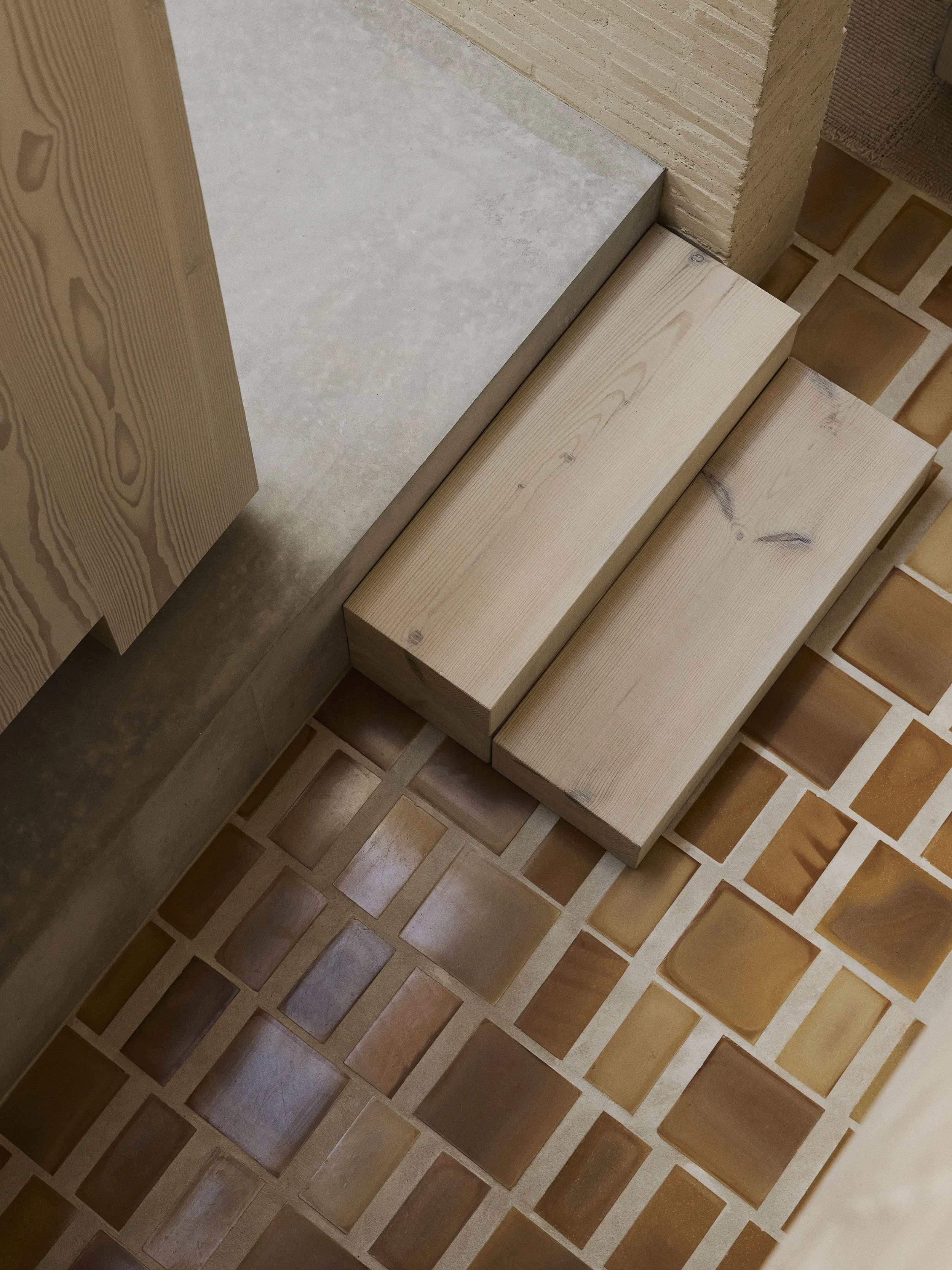As the detailing develops, the versatility of clay comes further into view. The material is not limited to walls or floors, but extends into smaller elements such as basins, handles and lighting, showing how specification can carry a material logic through the entire project rather than stopping at surface level.
