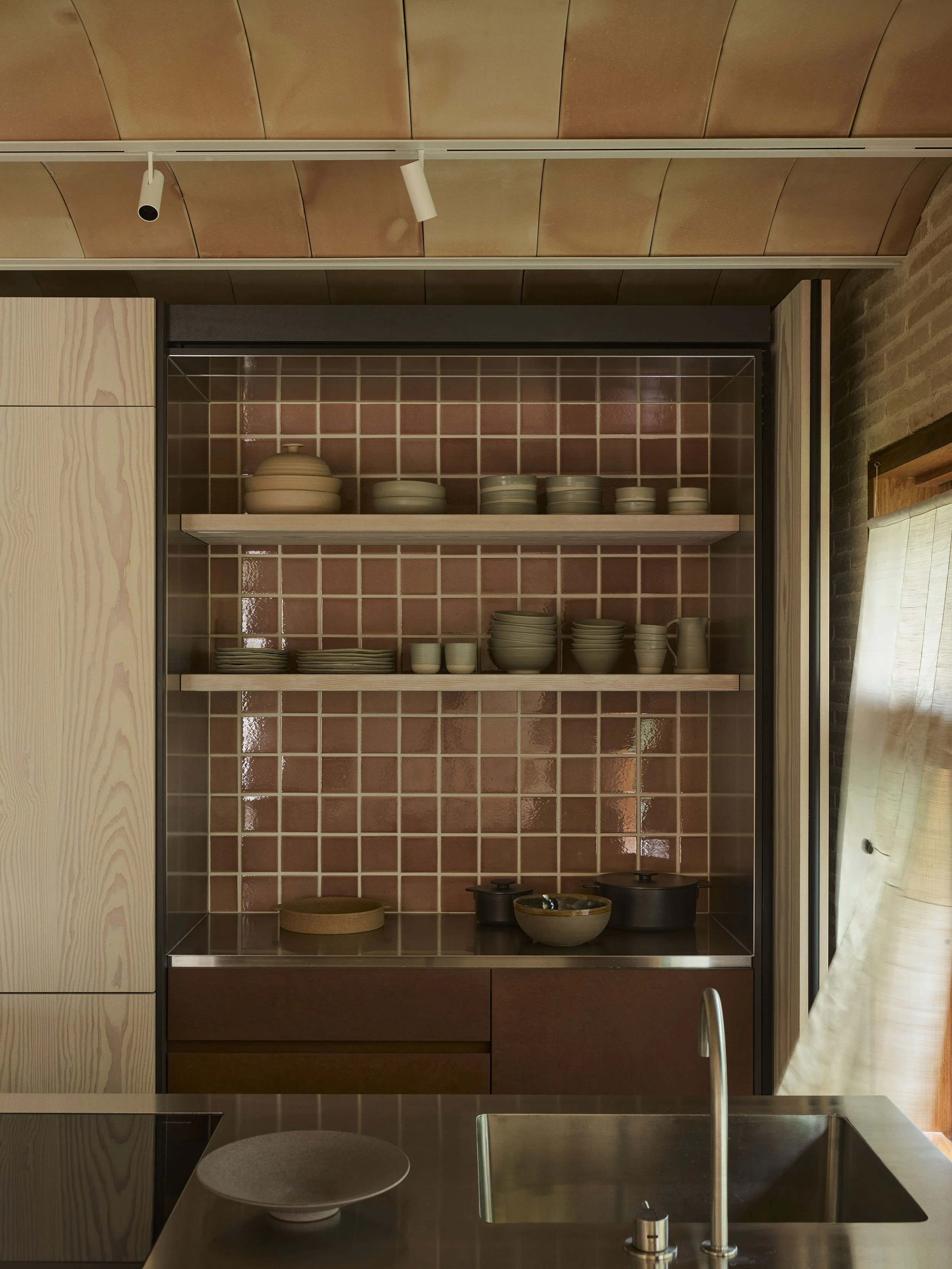Clay was not treated as a feature material, but as a foundational one. Brick, terracotta tiles, curved clay ceiling elements and ceramic details work together to create a consistent material language across the project. This continuity gives the house its quiet strength.